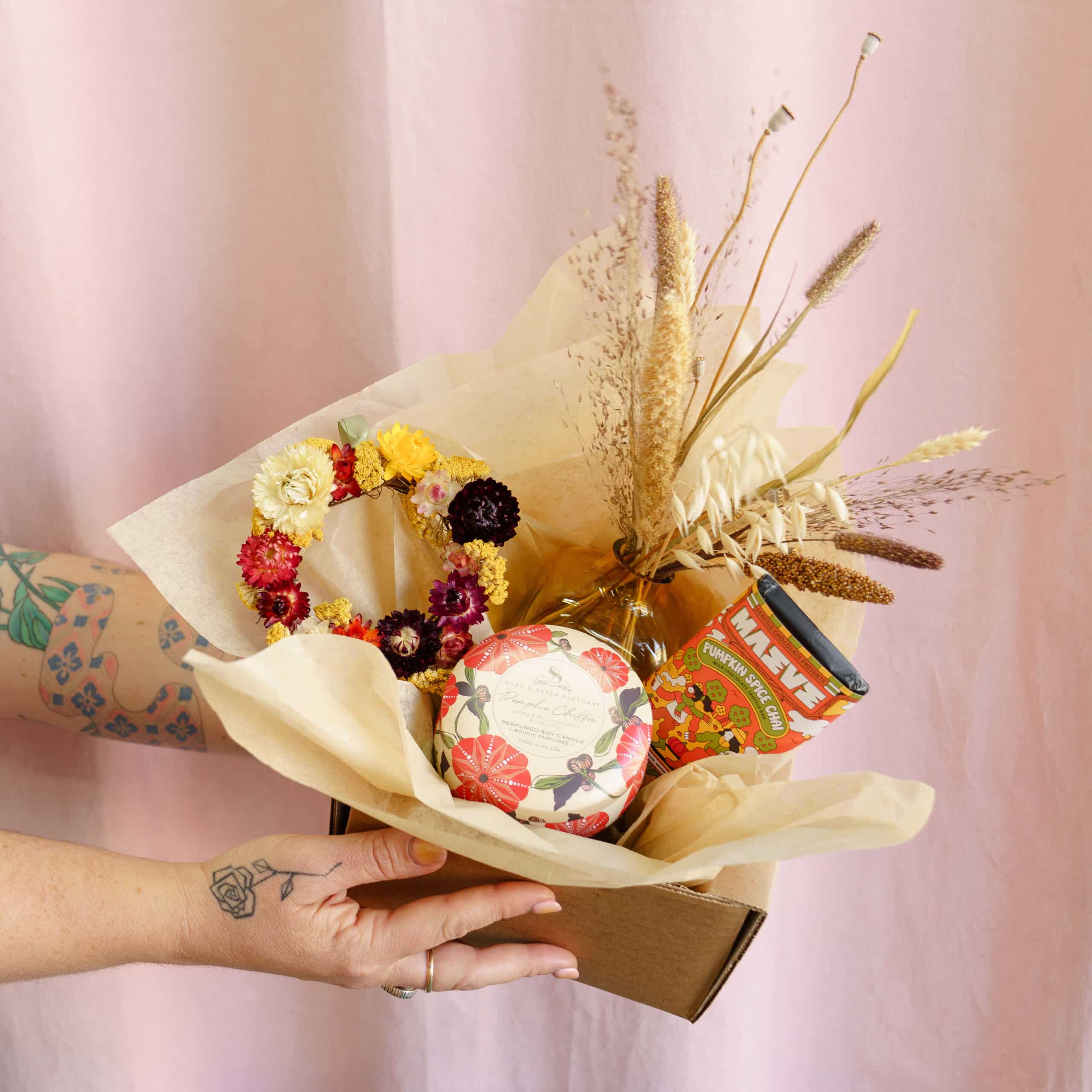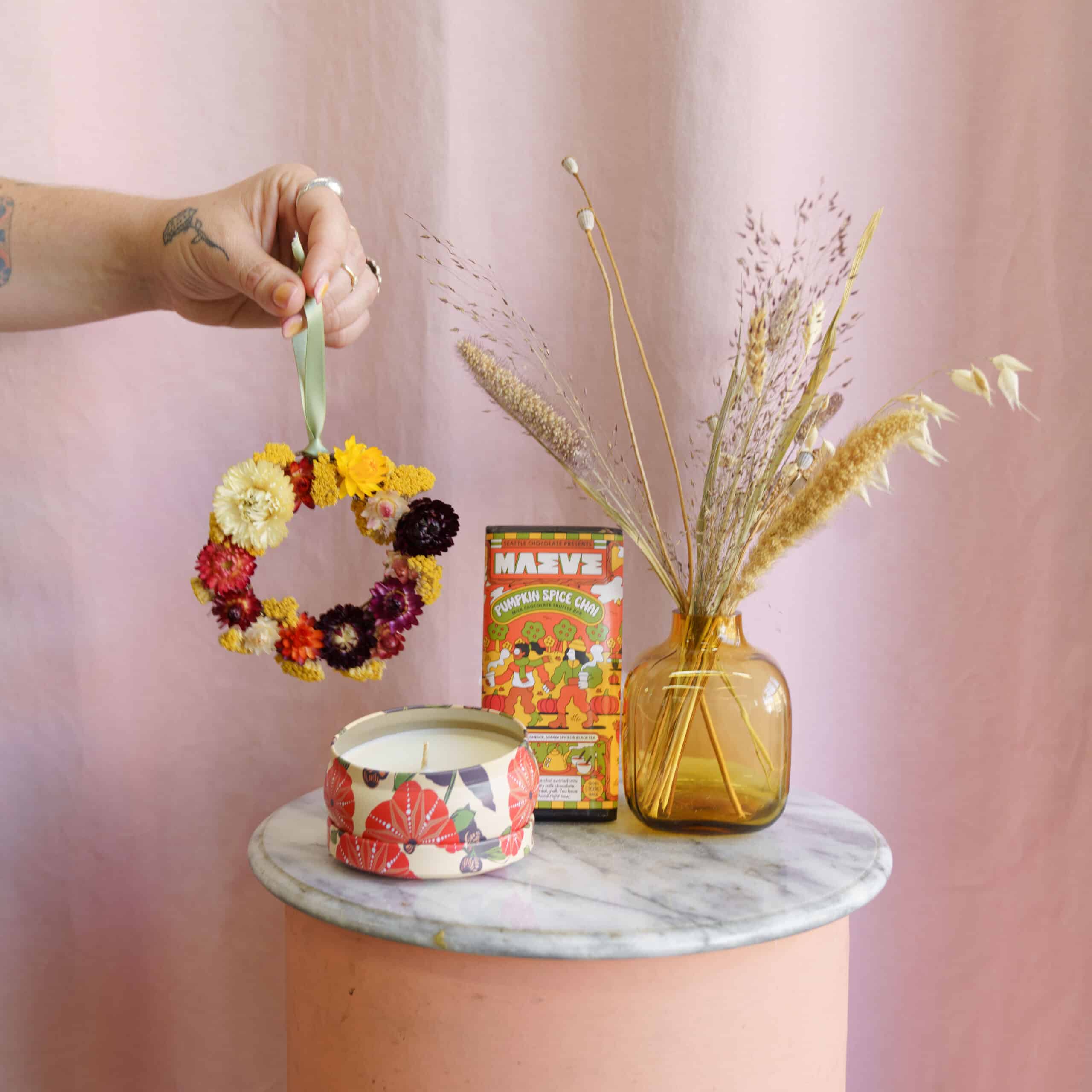 Pumpkin Chiffon candle from Soap + Paper Factory, Pumpkin Spice Chai Truffle bar from MAEVE, mini dried flower wreath, and amber bud vase designed with seasonal grasses and fall foliage.