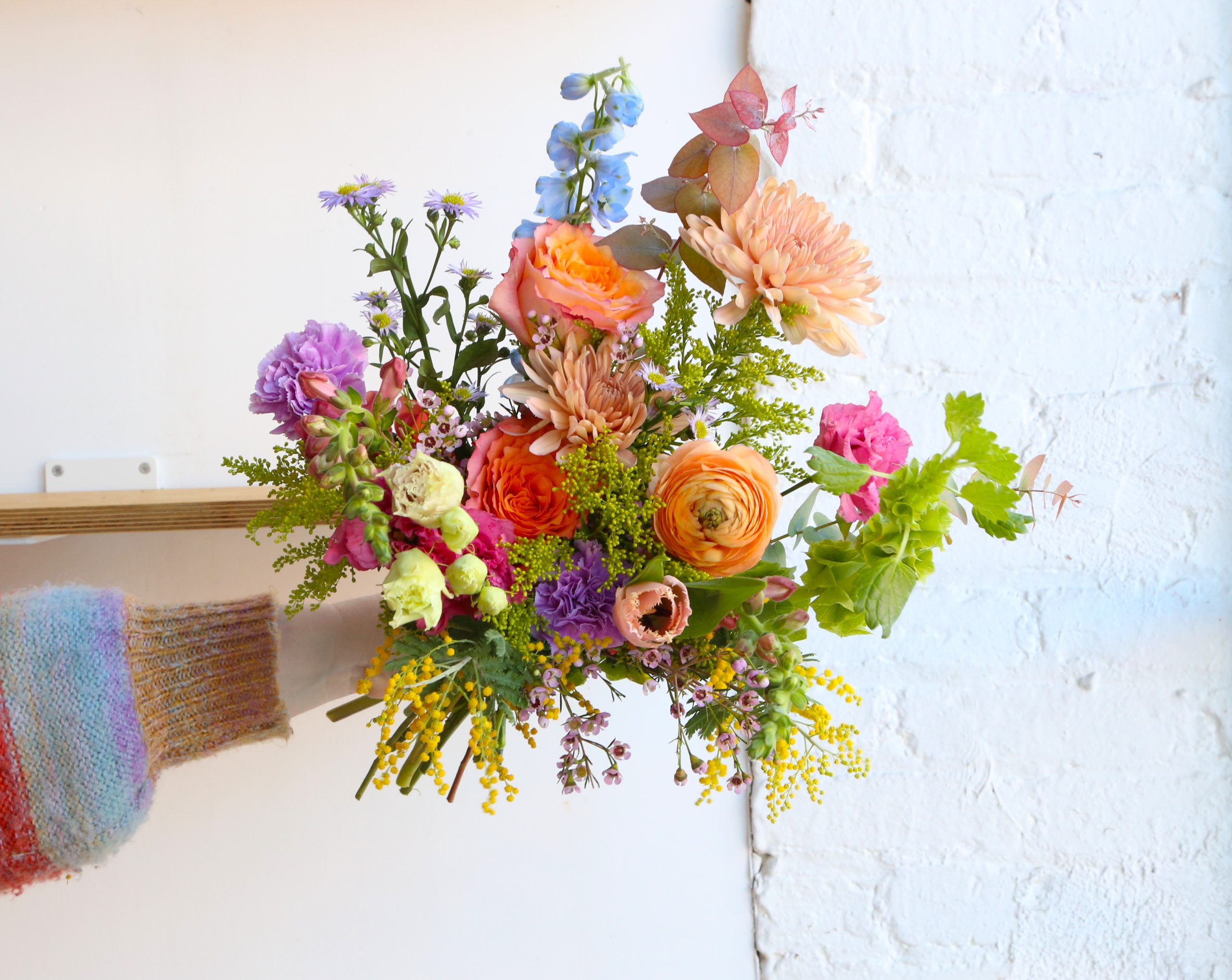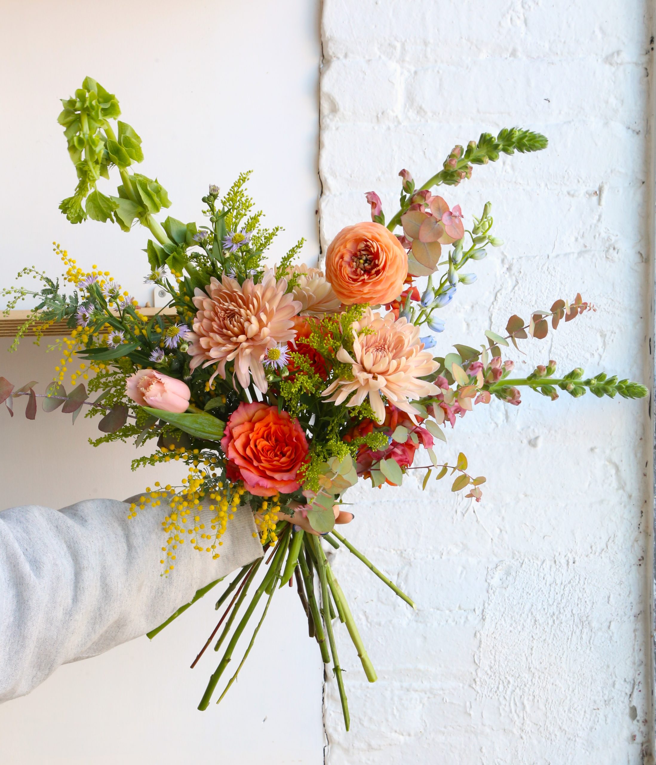 You can expect fresh roses, mums, snapdragons, bells of Ireland, solidago and a whisper of seasonal flowers sprinkled into these designs. We do not take special request for these wraps. Please order the Stems Signature Bouquet if you have special requests/inspo images or email us before ordering if you have nuanced requests.